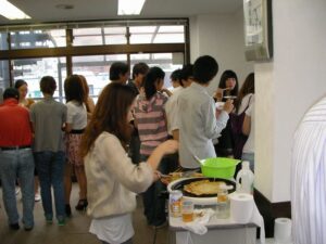 学生や先生たちが持ち寄ったおいしい料理をみんなで食べながら楽しく歓談しました。