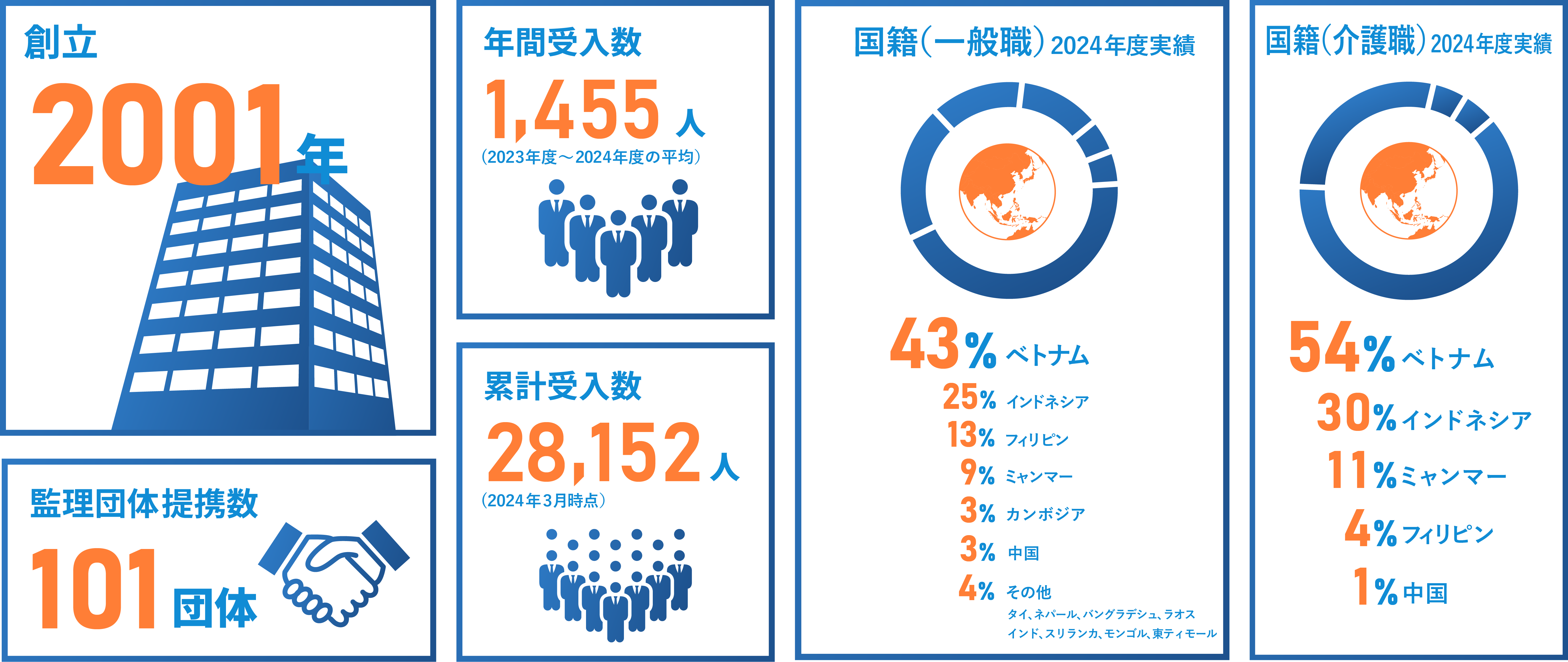 2001年の創立以来、数多くの監理団体様に支えられ、現在では年間2,000名を超える技能実習生をお預かりしてます。