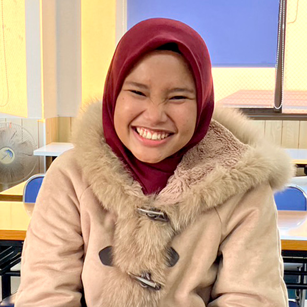 私は日本の介護を学びたいのと、日本人のような礼儀正しい人になりたいとの思いから日本に来ました。学校の先生はとても優しく、インドネシアでは勉強しなかったことが学べてとても良いです。会社に行ったら、職場の人と利用者様と仲良くなりたいです!それと、日本の北海道から沖縄までいろんなところに行きたいです。